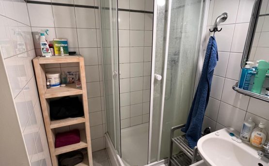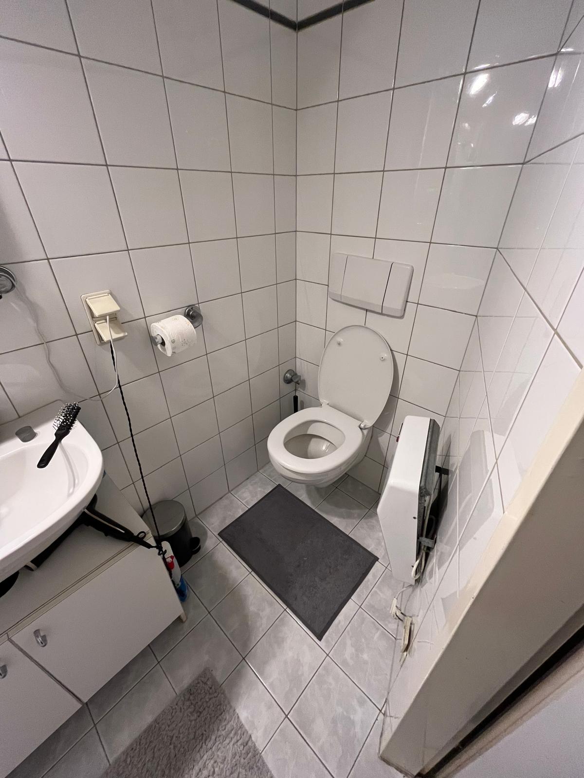 - ein Badezimmer mit Dusche und WC
